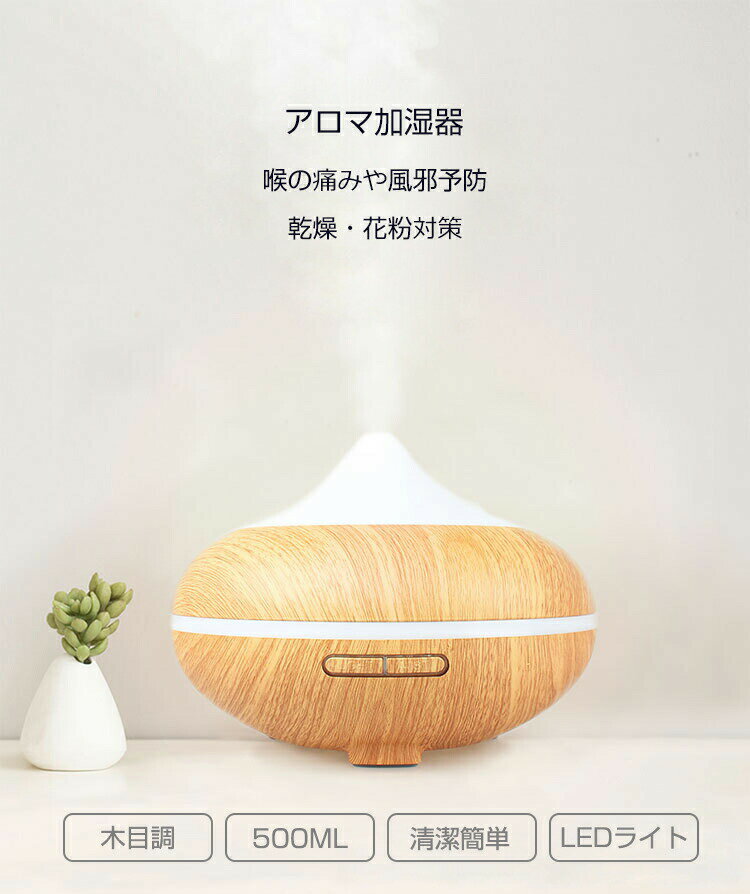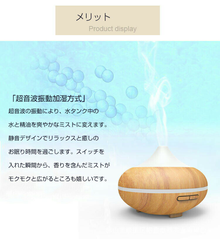 【仕様】 電源:DC12V 電源コード:約150cm パワー:約12W モード:1H/3H/6H/ON 加湿量:強モード65ml/h 弱モード40ml/h 水箱容量:≤500ML LED:3pcs 素材:PP/ABS/PC カラー:ナチュラル、ダークブラウン、ホワイト、ブラック ミスト化シード振動率:2.4MHZ サイズ:約181*181*135mm 重量:約420g 【商品内容】 本体、ACアダプター、マニュアル 【特徴】 超音波の振動により、水タンク中の水と精油を爽やかなミストに変えます。