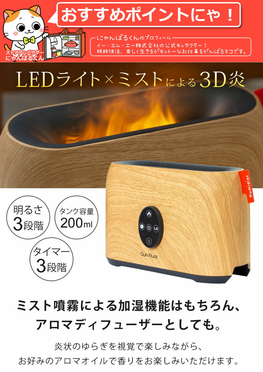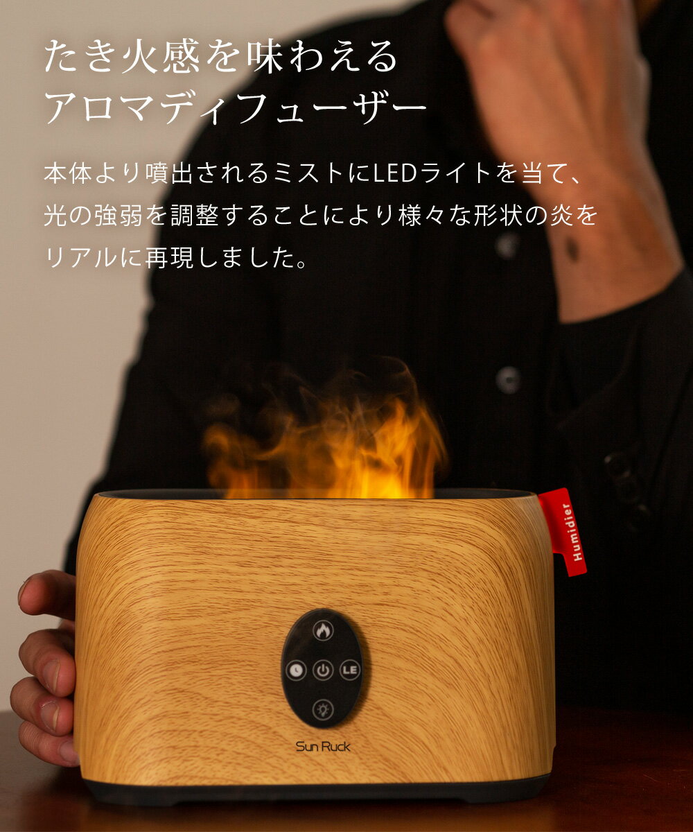 アロマディフューザーの使い方 焚火感を室内で味わえる 本体より噴出されるミストにLEDライトを当て、光の強弱を調整することにより様々な形状の炎をリアルに再現しました。