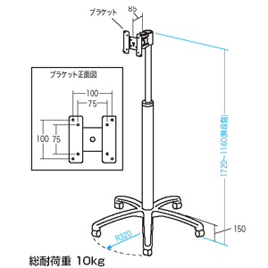 ●高さは1160から1720mmまで可動し、任意位置で固定することができます(ネジで固定)●VESA規格に準拠し、75×75mmおよび100×100mmの取付け穴を有する液晶ディスプレイがマウントできます。