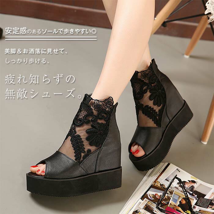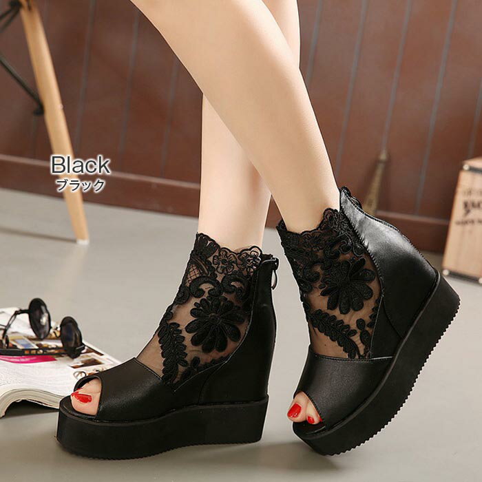 ブーツサンダル 厚底サンダル レディース インヒール レース 花柄 サンダル ヒール10cm ヒールサンダル オープントゥ 疲れにくい 痛くない 歩きやすい サマーブーツ ブーティ シューズ ゴシック ロリータ ゴスロリ 10cm 10センチ パンプス ハイカット オシャレ ブラック