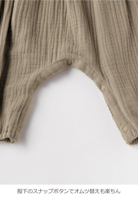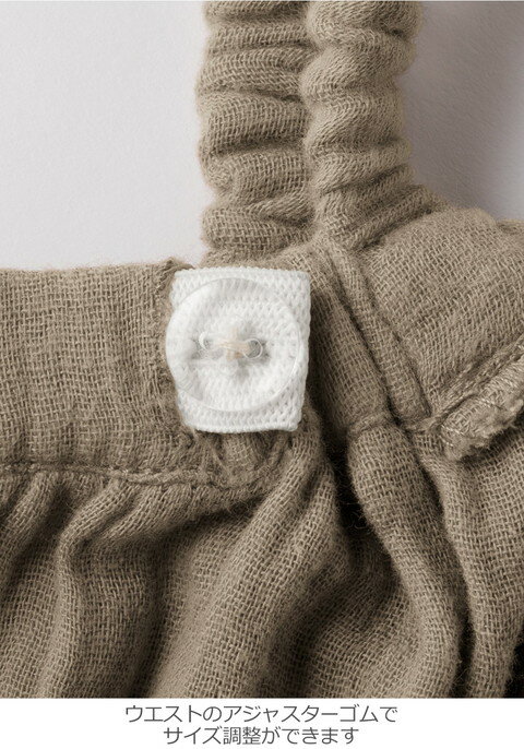 ・洗うほどふっくらとして肌になじむやわらかダブルガーゼ素材は敏感肌のベビーにも優しくおすすめです・ウエスト部分のアジャスターゴムで細やかな調整ができます・好みに合わせて選べるニュアンスカラーが嬉しい・同素材のママアイテムとリンクコーデも楽しめます
